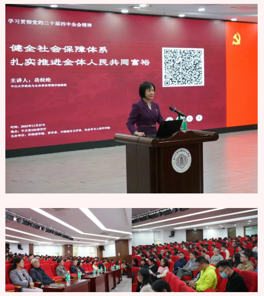 11月27日下午,外国语学院党委、中文无码 党委、中国语言文学系党委、社会学与人类学学院党委联合举办学习贯彻党的二十届四中全会精神专题讲座,邀请了政治与公共事务管理学院岳经纶教授主讲“健全社会保障体系,扎实推进全体人民共同富裕”专题报告。讲座会场设在中文堂105讲学厅,四个院系的党委理论学习中心组成员、师生党员、入党积极分子、发展对象等300余人参加学习。讲座由外国语学院党委书记张东蕙主持。